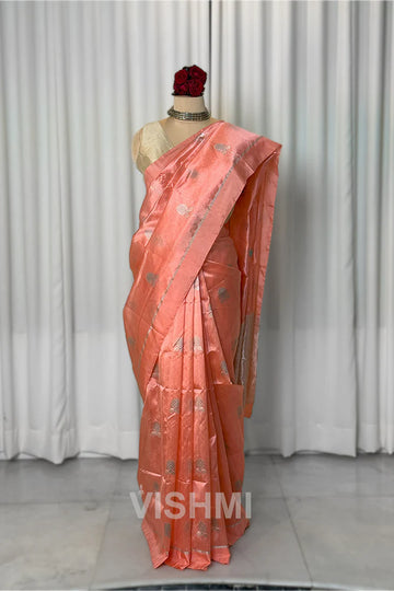 Pink Handloom Silk Tissue Linen Lotus Paithani Pallu Saree