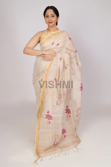 White Pure Metallic Muslin Silk Saree with Lotus Hand Embroidery