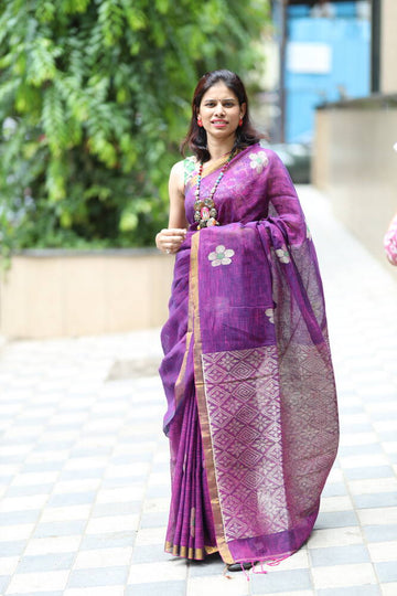 Purple Pure Metallic Muslin Silk Saree with Lotus Hand Embroidery