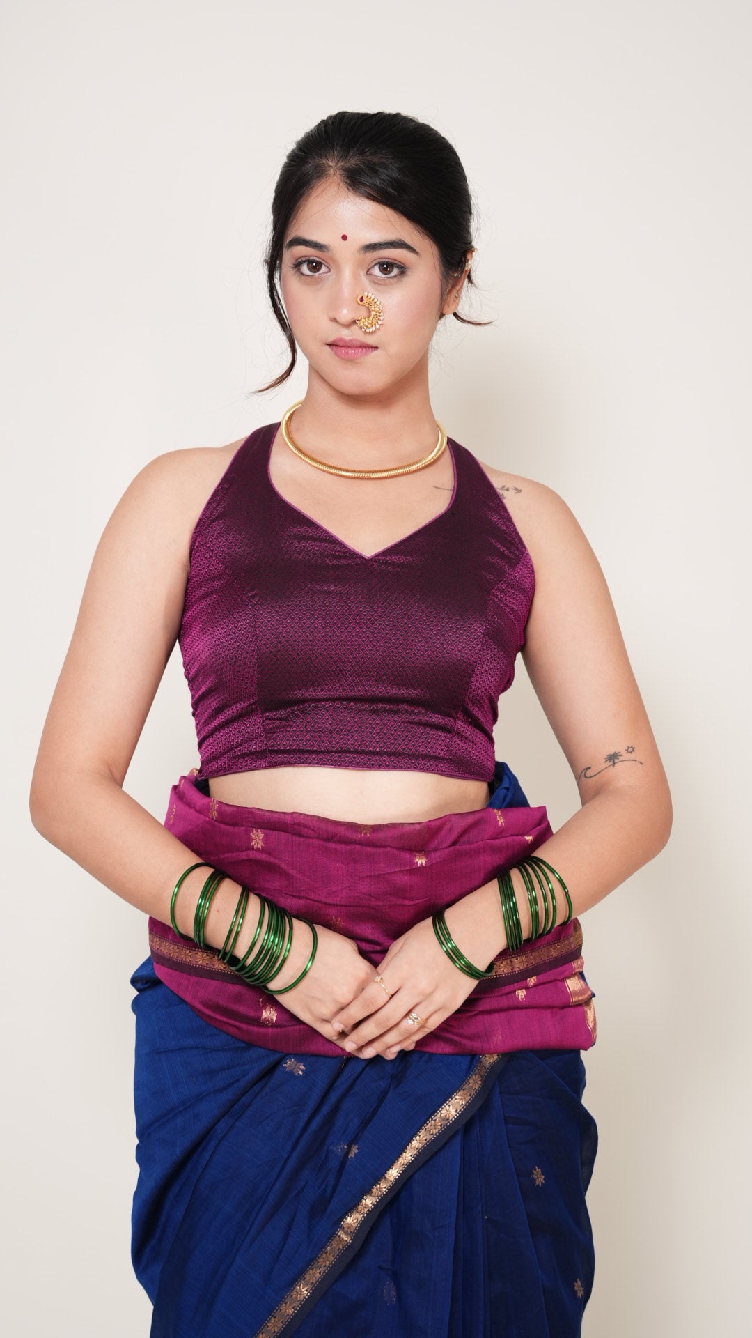 Elevate your ethnic wardrobe with this stunning magenta halter neck khun blouse. The sleeveless design...