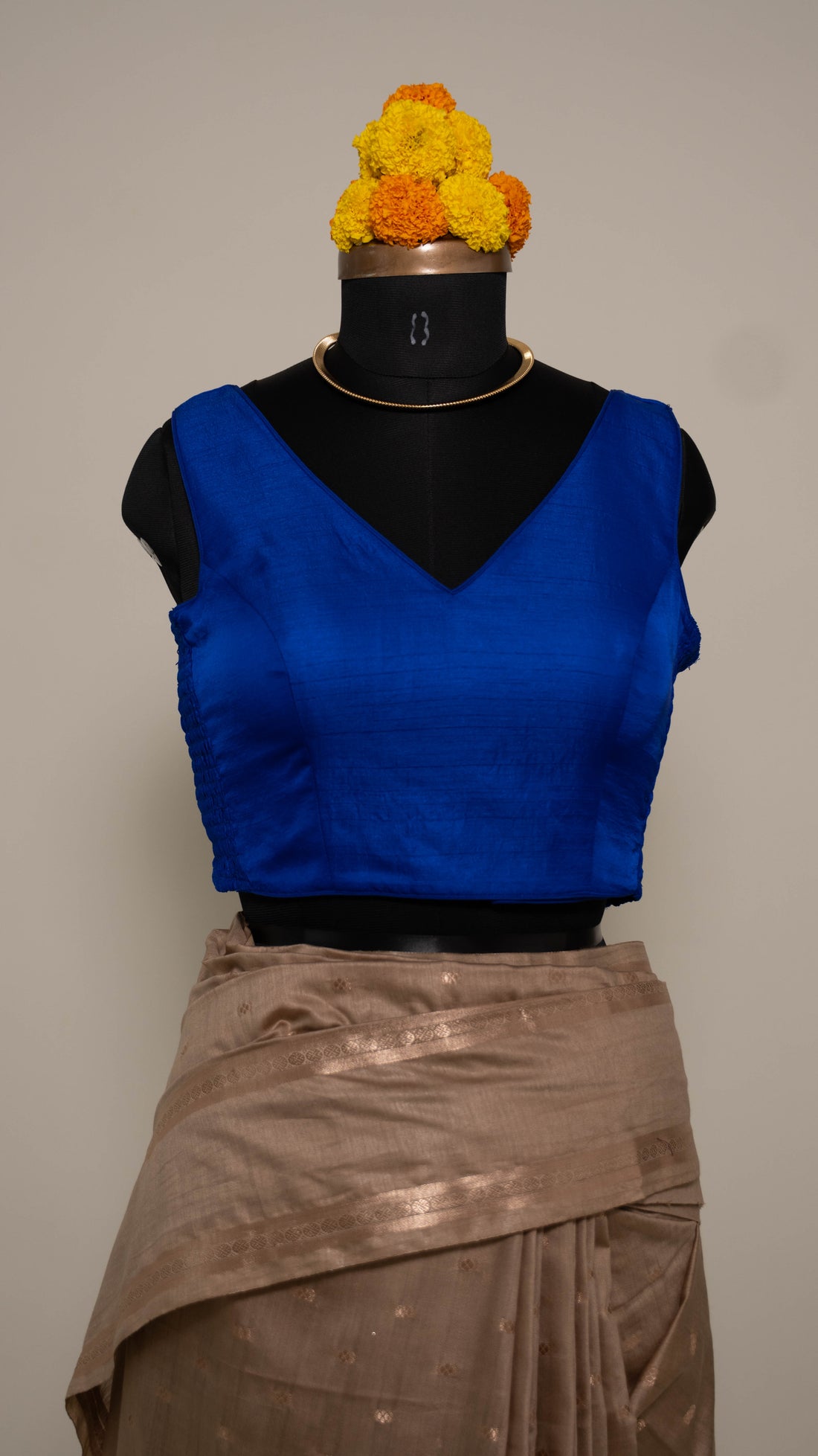 Electric Blue Soft Silk V Neck Padded Blouse With Attached Sleeves