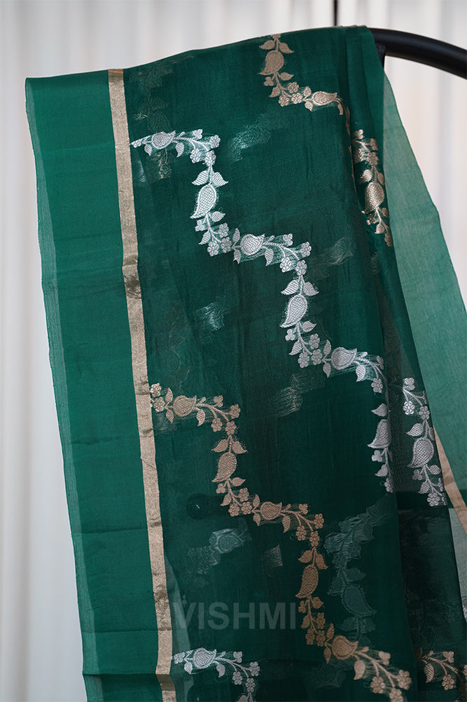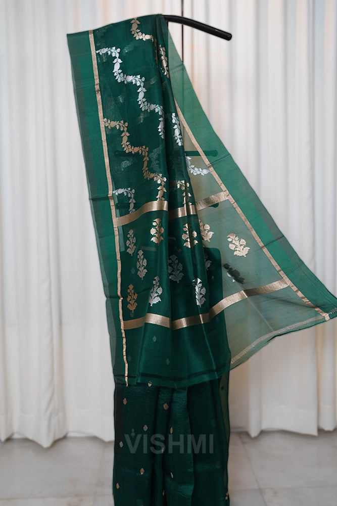 Bottle Green Kora Silk Kadwa Sona Roopa Banarasi Saree