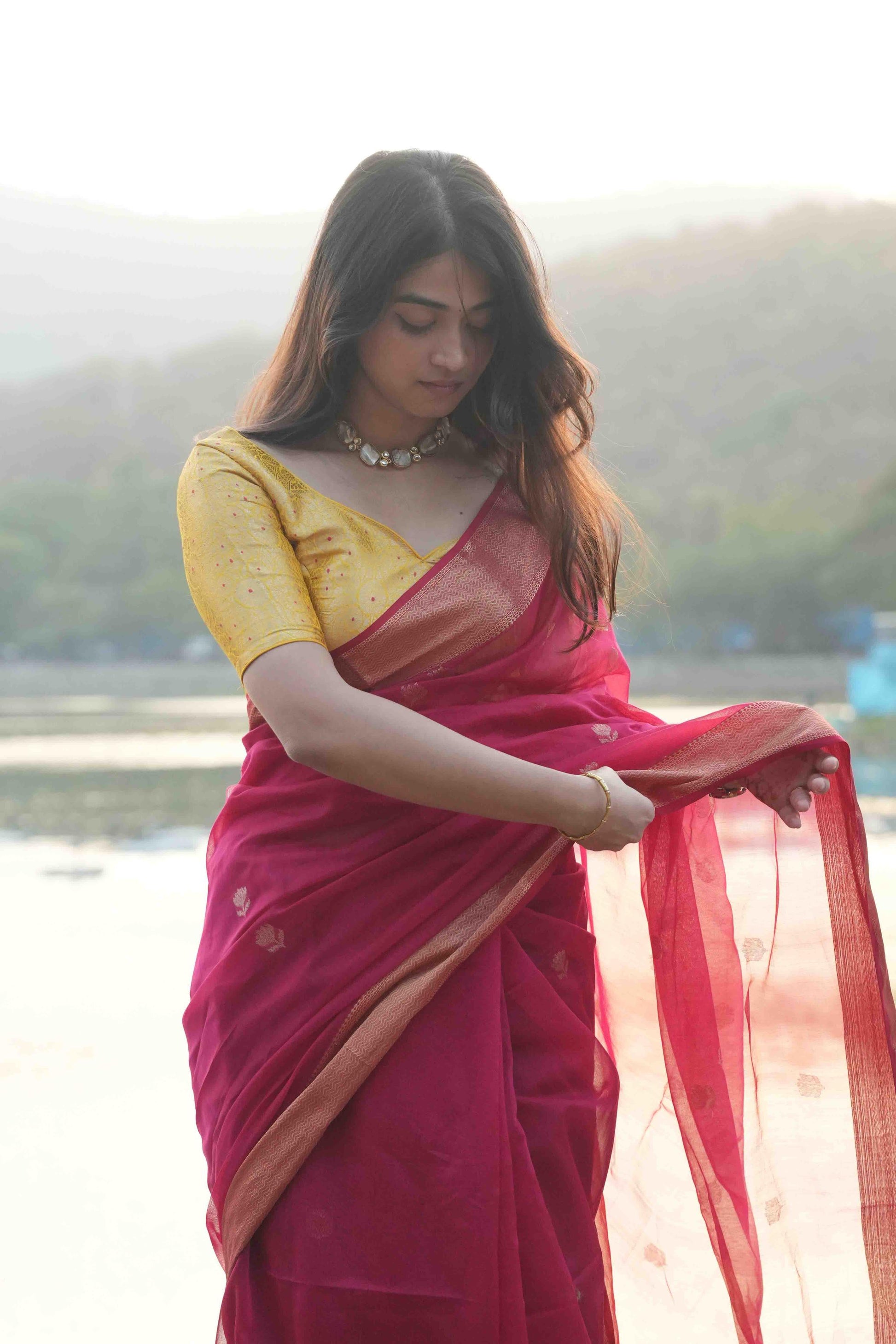 Hot Pink Maheshwari Lotus Butti Handloom Saree