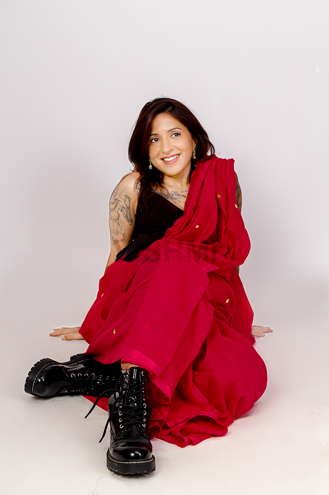 The saree’s standout feature is the hand stitched bindi detailing, meticulously crafted by skilled artisans to add a unique, textured embellishment that enhances the fabric’s charm without overpowering it. These tiny, precise stitches create subtle patterns or scattered accents that bring a handcrafted elegance to your look.