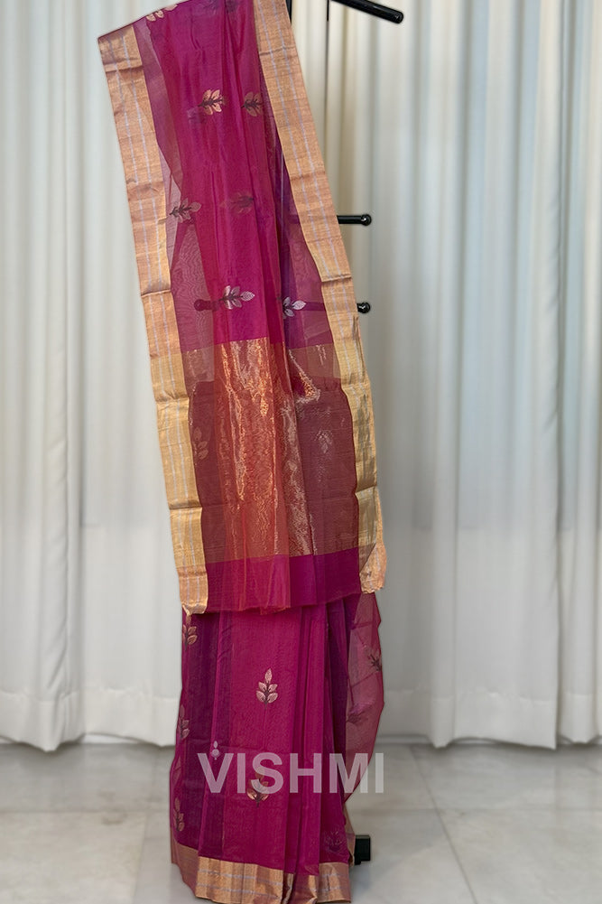 Graceful and lightweight, this Silk Cotton Handloom Chanderi Saree is a blend of tradition and elegance. Handwoven by skilled artisans of Chanderi, Madhya Pradesh, this saree is celebrated for its sheer texture, glossy transparency, and luxurious drape.